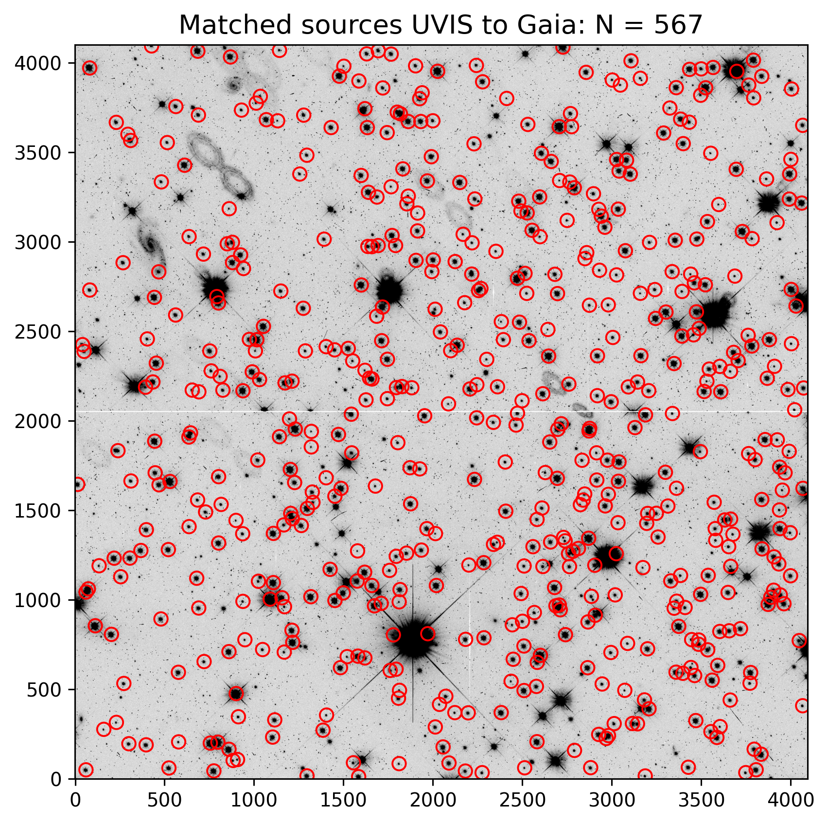 plt.title(f'Matched sources UVIS to Gaia: N = {len(match_tab)}', fontsize=14)