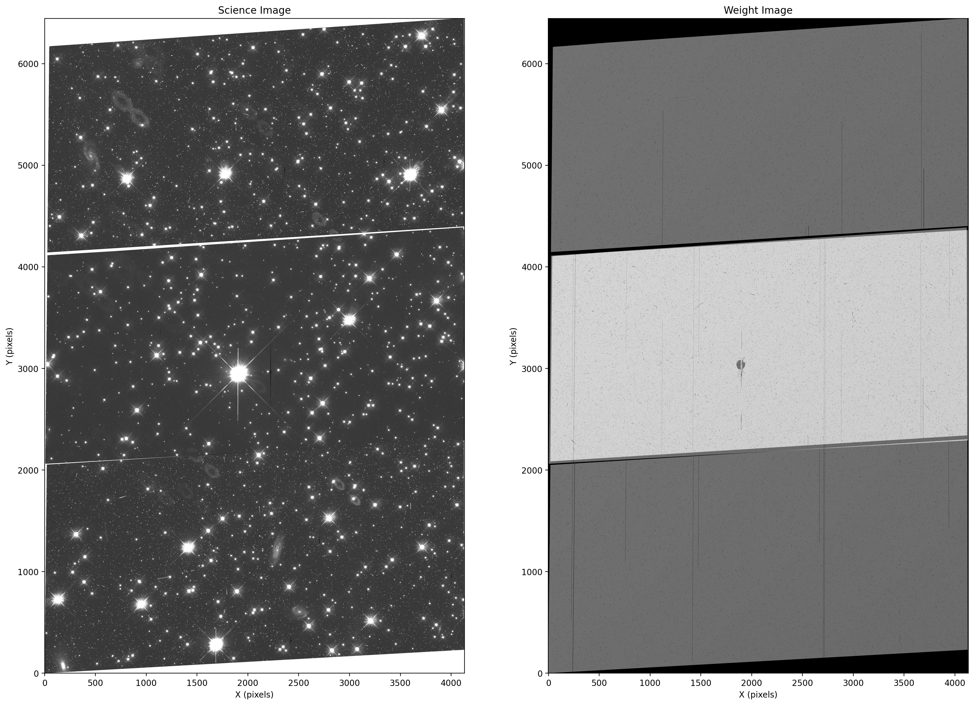 Display the combined science and weight images. In this example there appear to be three detector chips due to the large dither that was used in the observations. We note that the exposures overlapped in the center region, as evidenced by the increased value of the weight map corresponding to a longer effective exposure time. In addition, the resulting mosaic is better cleaned of artifacts and cosmic rays in this region due to the multiple exposures, as seen by the uniform background in the science mosaic.