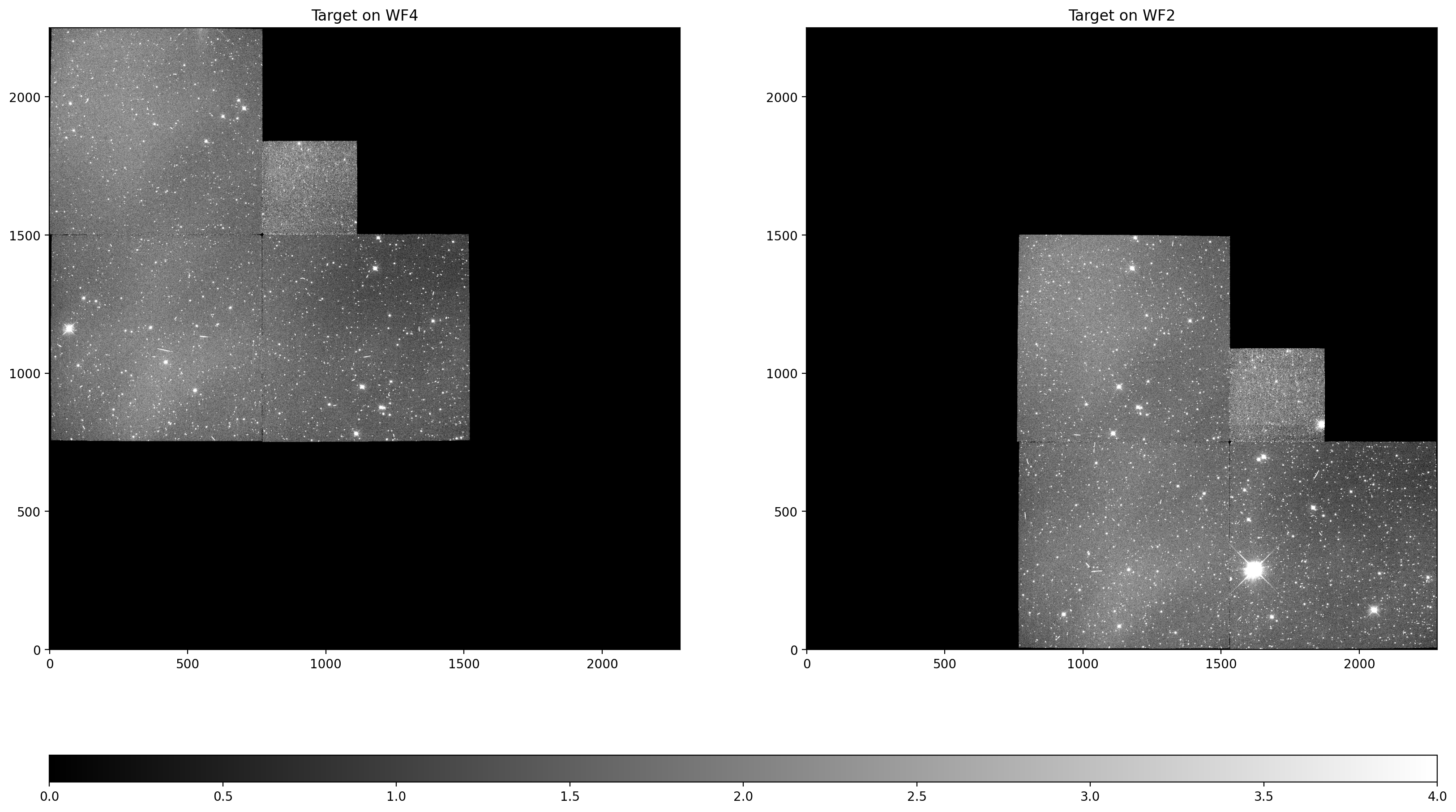 Here we compare the single drizzled frames. Note that WF4 and WF2 overlap in the footprint on the sky.