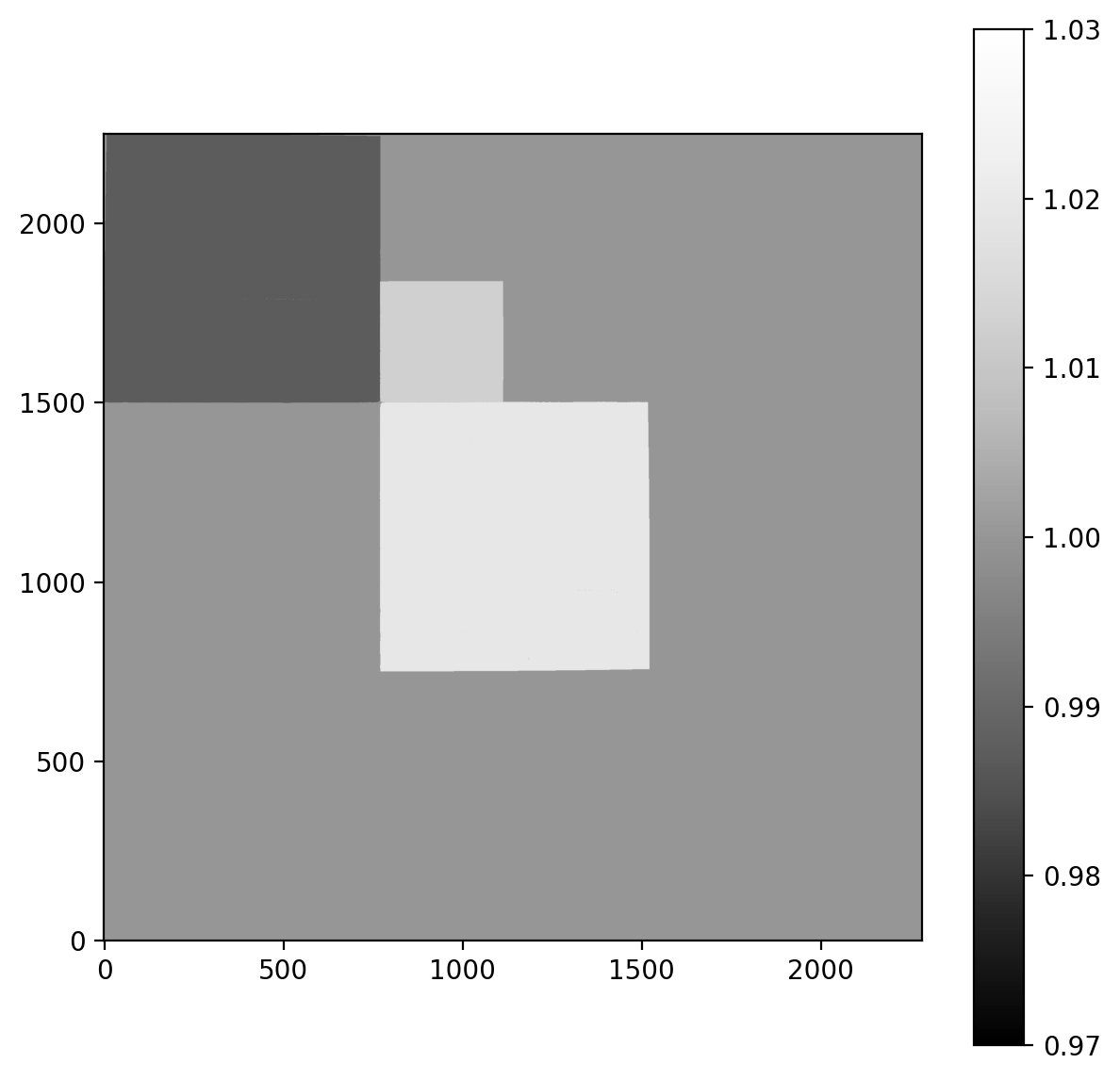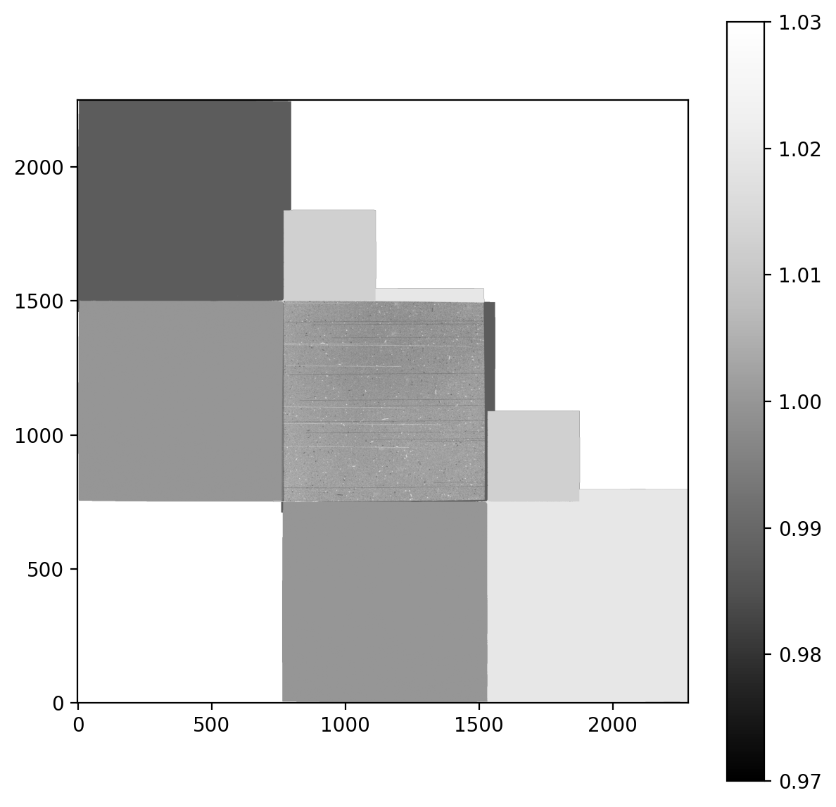 Inspect the ratio of the two drizzled images to see changes due to photometric normalization#