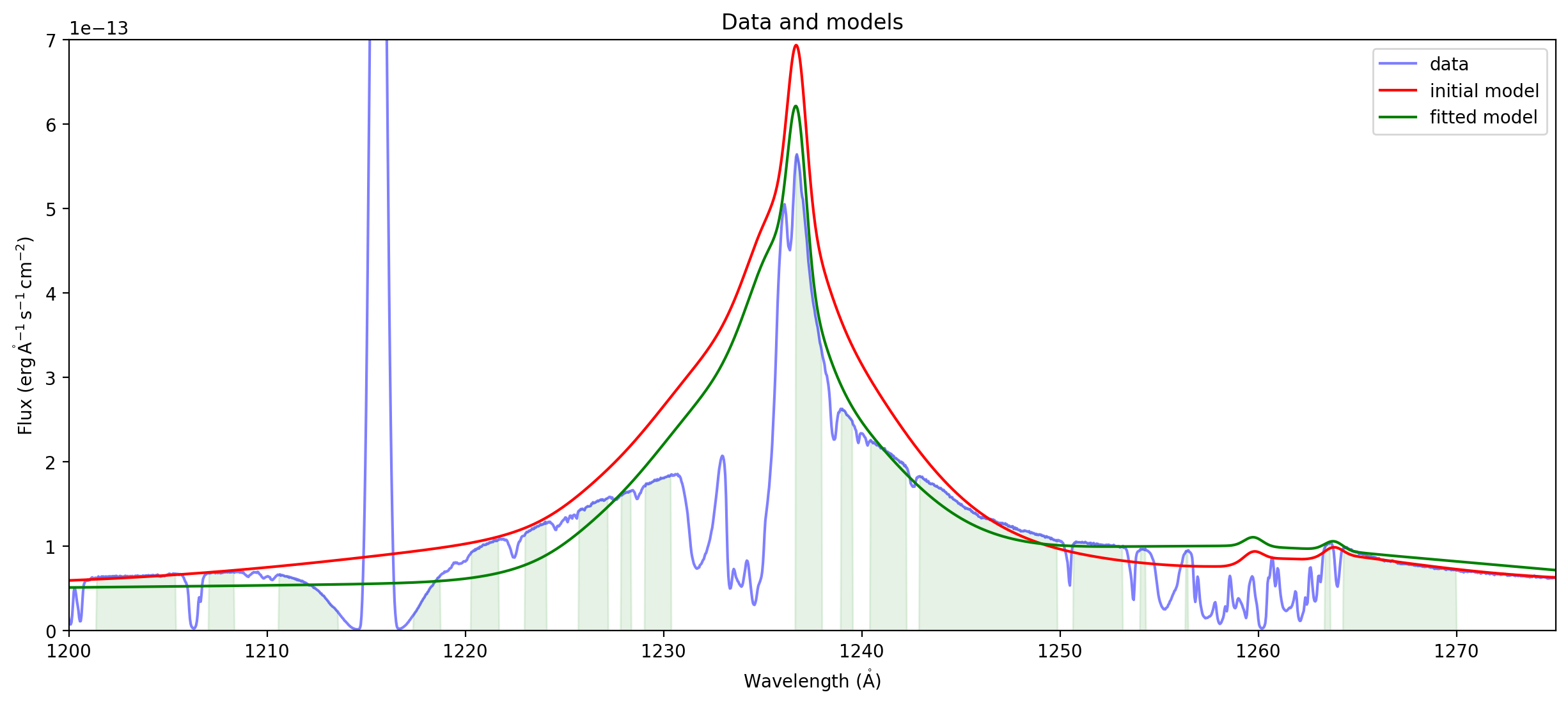 ax.plot(wavelength, fit_result(wavelength), 'g',label='fitted model')